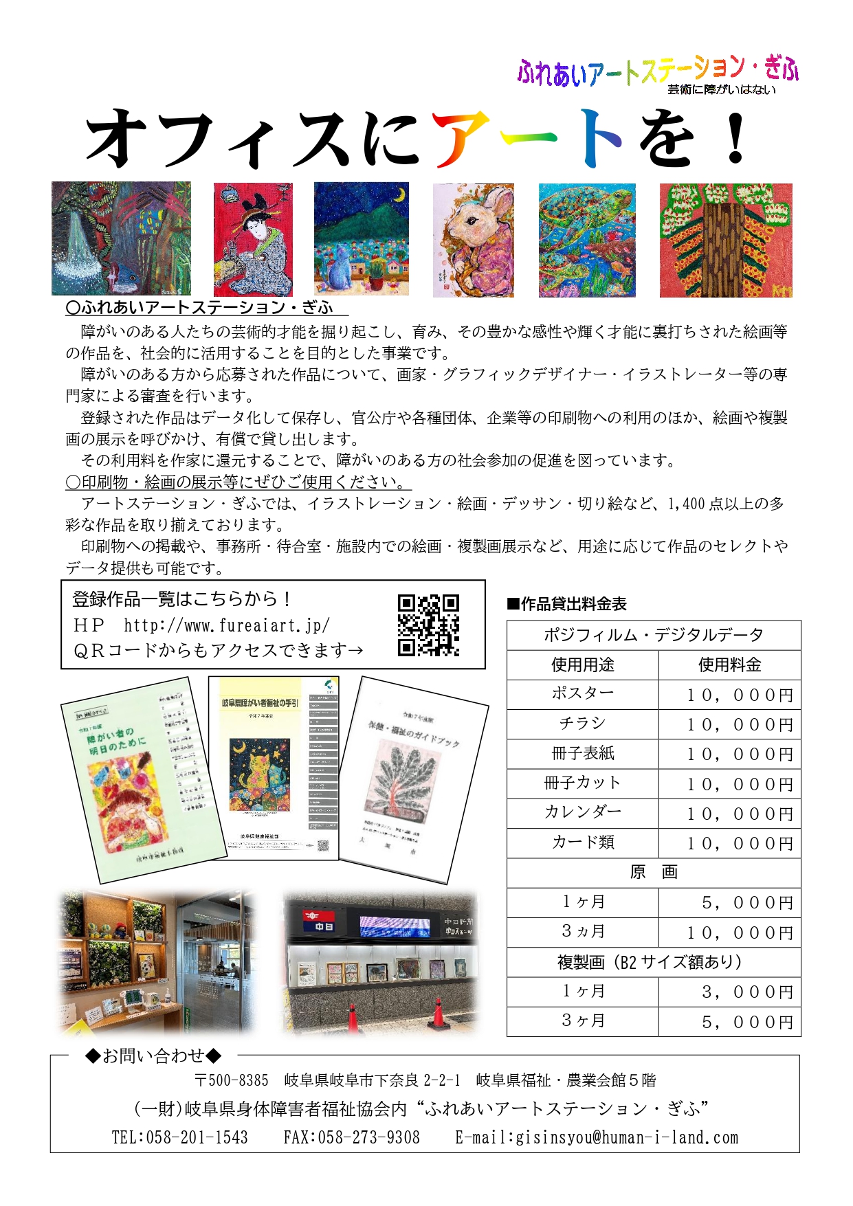 障がいのある方から応募された作品をデータ化して保存し、官公庁や各種団体、企業等の印刷物への利用のほか、絵画や複製画の展示を呼びかけ、有償で貸し出します。