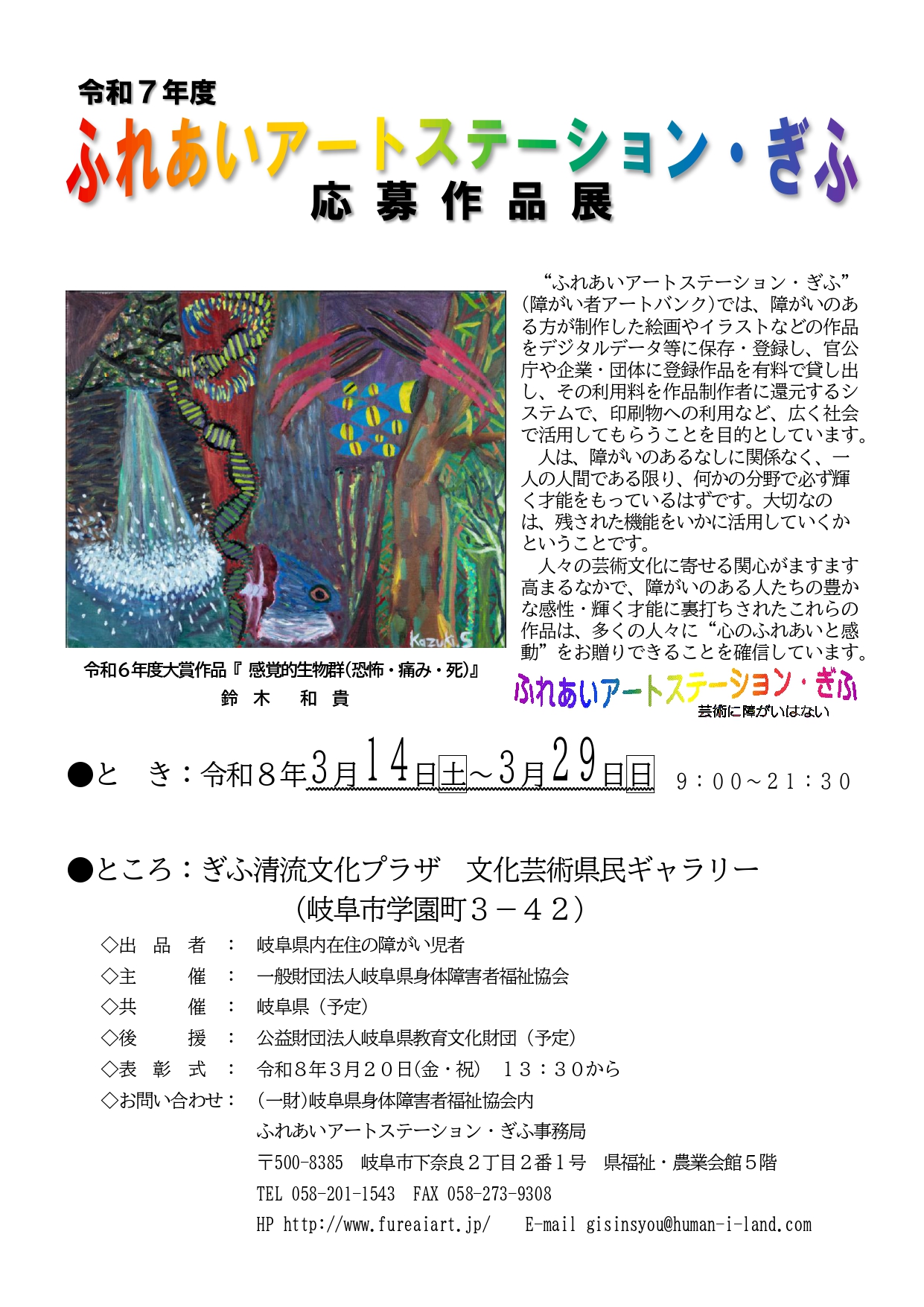 このたび、令和8年3月14日(土)から3月29日(日)まで“ぎふ清流文化プラザ1階文化芸術県民ギャラリー”において「令和7年度ふれあいアートステーション・ぎふ応募作品展」と題し、展示会を開催いたします。